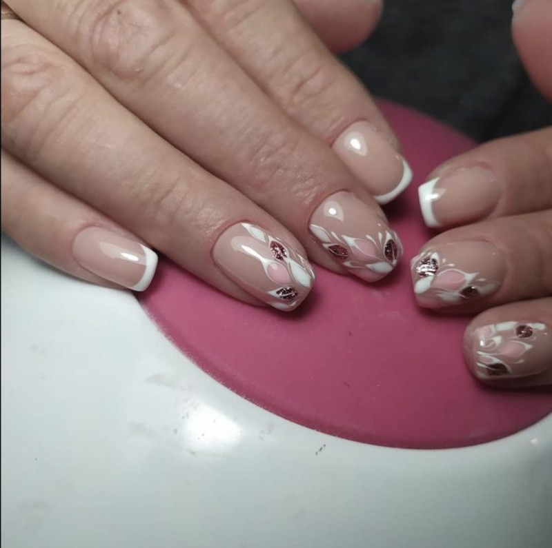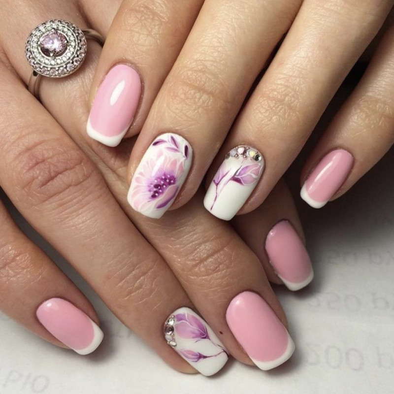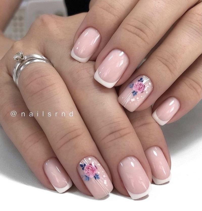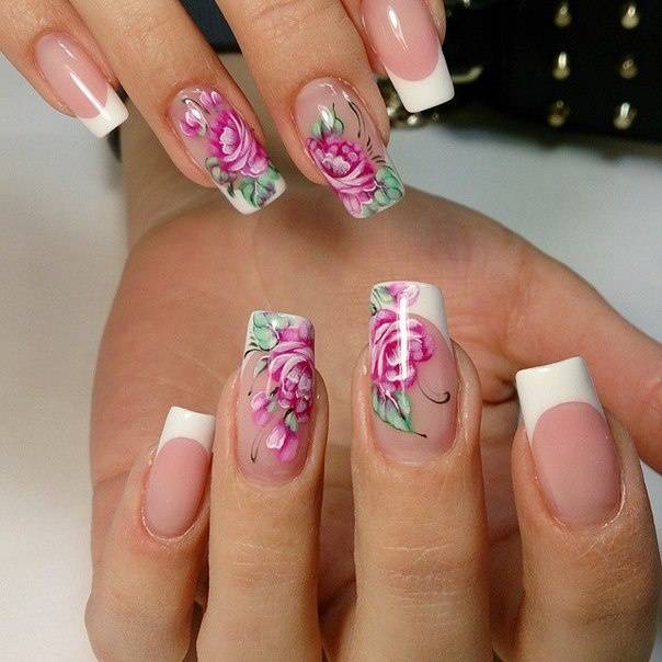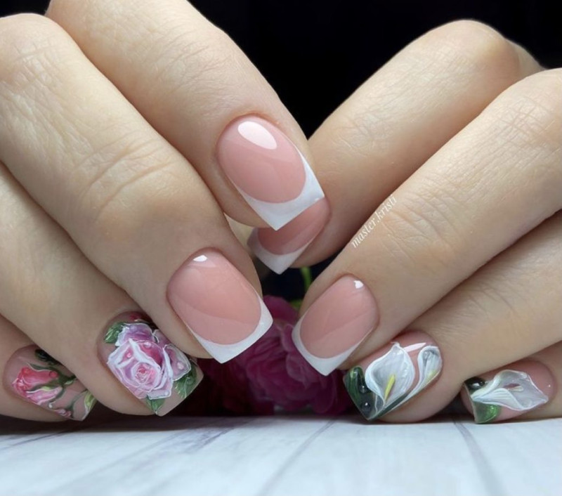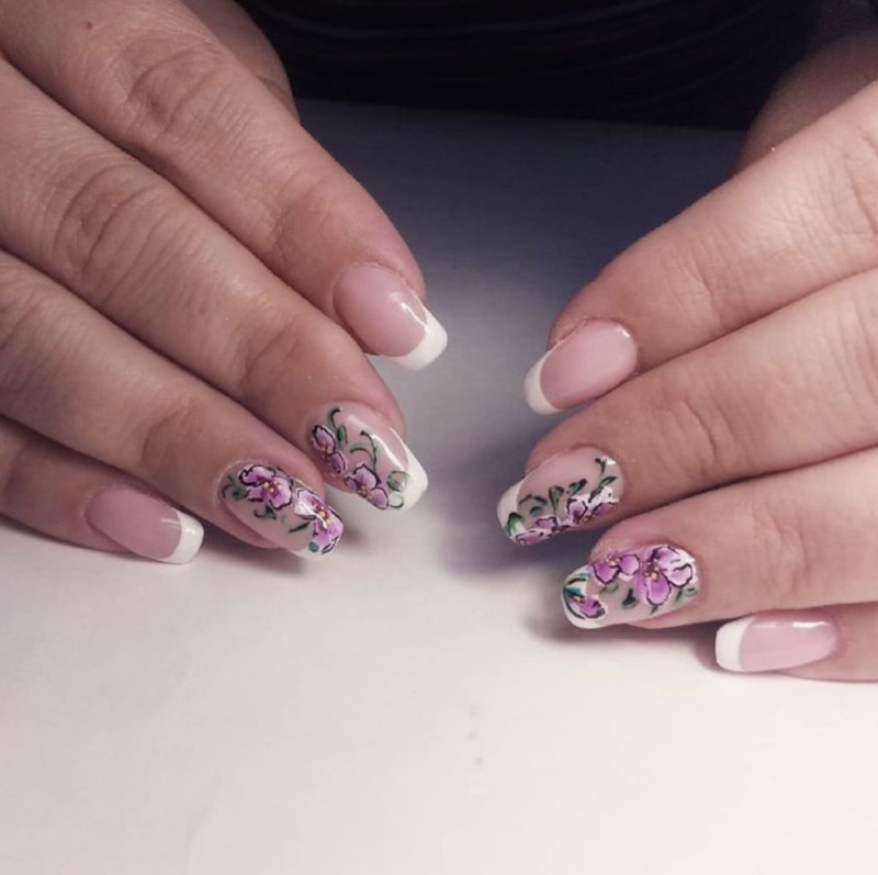 Чаще всего френч дополняют изящными цветочными мотивами. Они подчеркивают нежность и легкость дизайна. Для создания такого рисунка стоит выбирать пастельные тона. Впрочем, если вы хотите добиться яркого акцента, то насыщенные оттенки станут отличным решением.