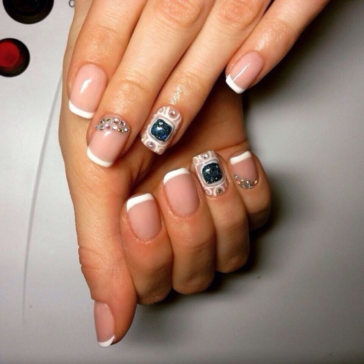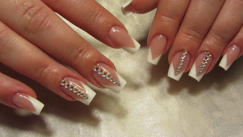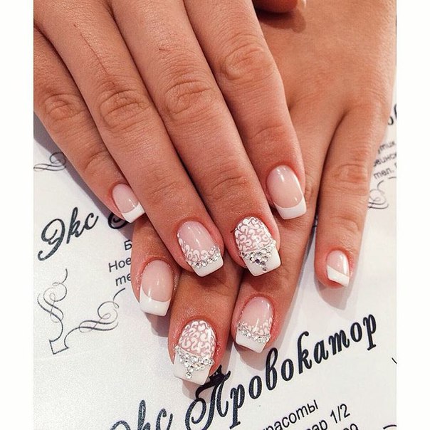 Французское оформление пальчиков с четкими стразами станет отличным вариантом дизайна для невест. Аккуратно выполненная роспись будет добавлять ногтям дополнительный изыск. Шик такому дизайну придает сдержанность.