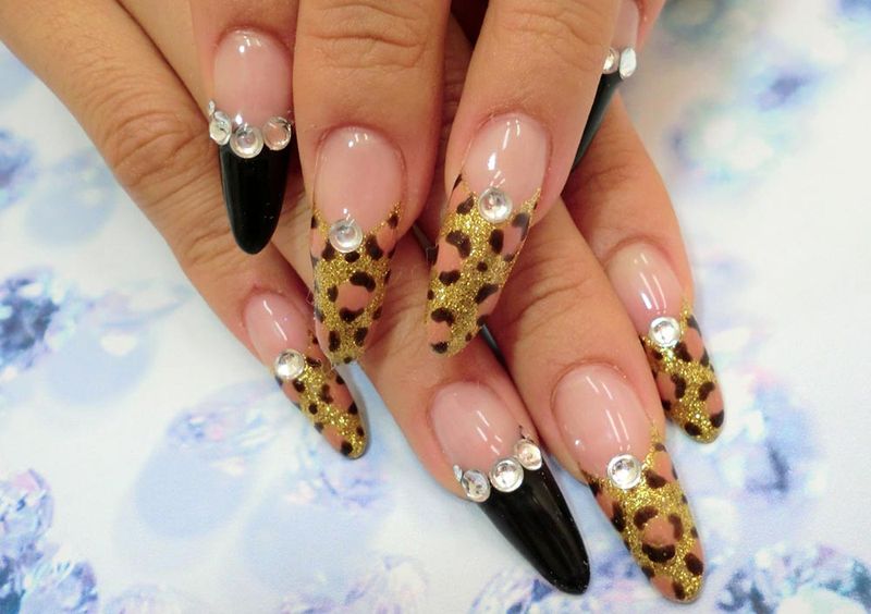 Для исполнения эффектной идеи потребуется лак с золотистыми блестками, тонкая кисточка и пара страз для ногтей.