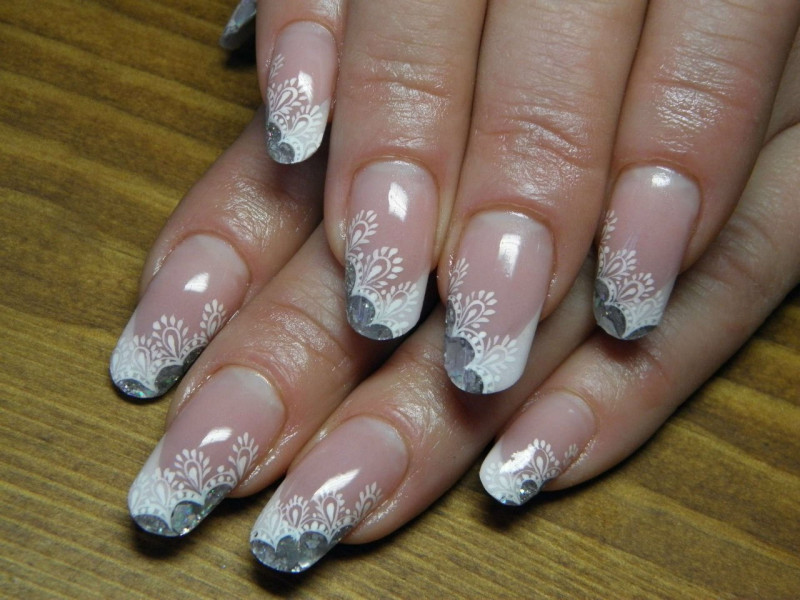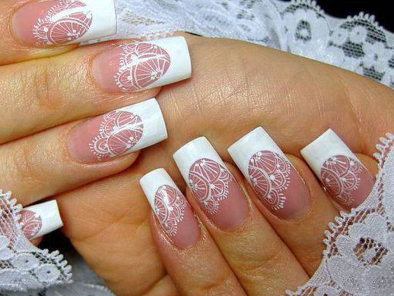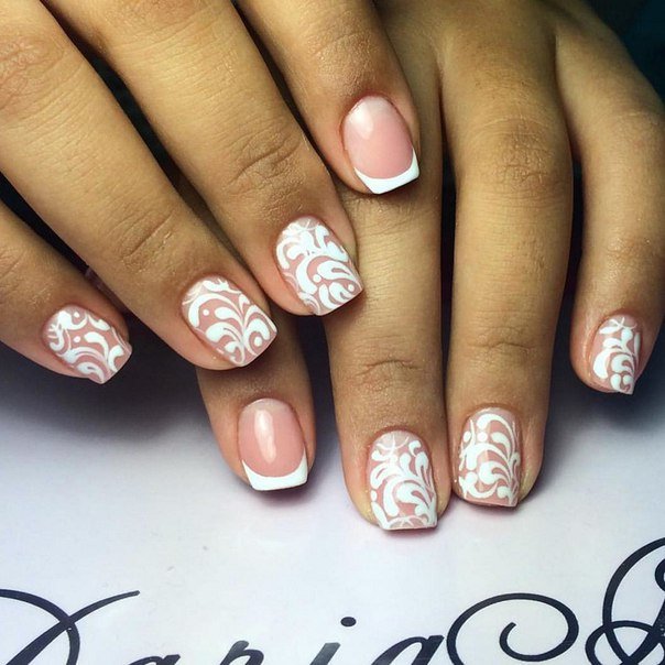 Кроме этого дизайнеры предлагают украсить дугу края ноготка кружевными узорами с внутренней стороны тем же белым лаком. Актуально и эффектно такой маникюр будет смотреться вместе со свадебным платьем невесты, который еже больше подчеркнет нежность и хрупкость образа.