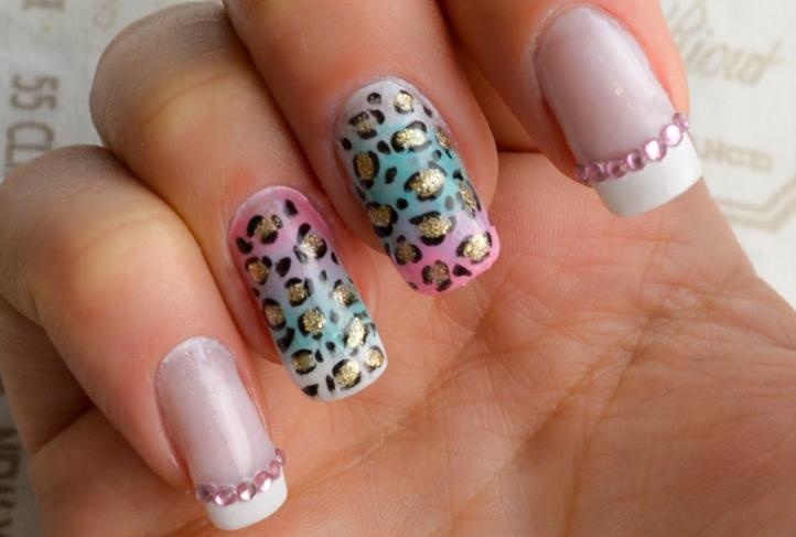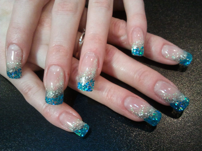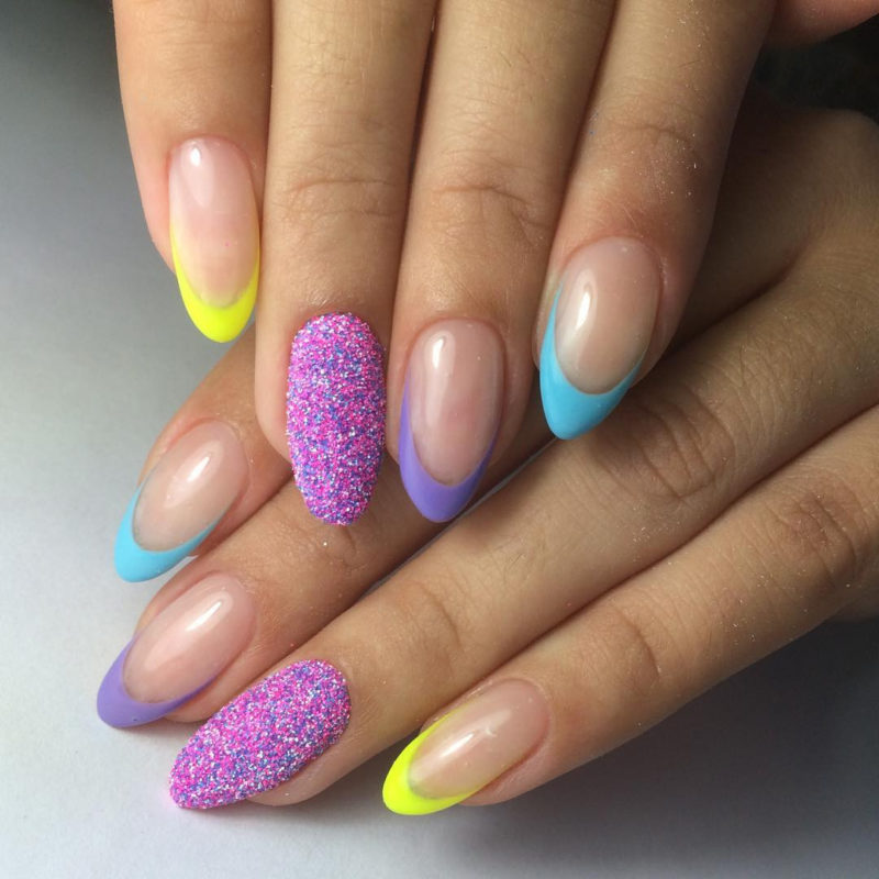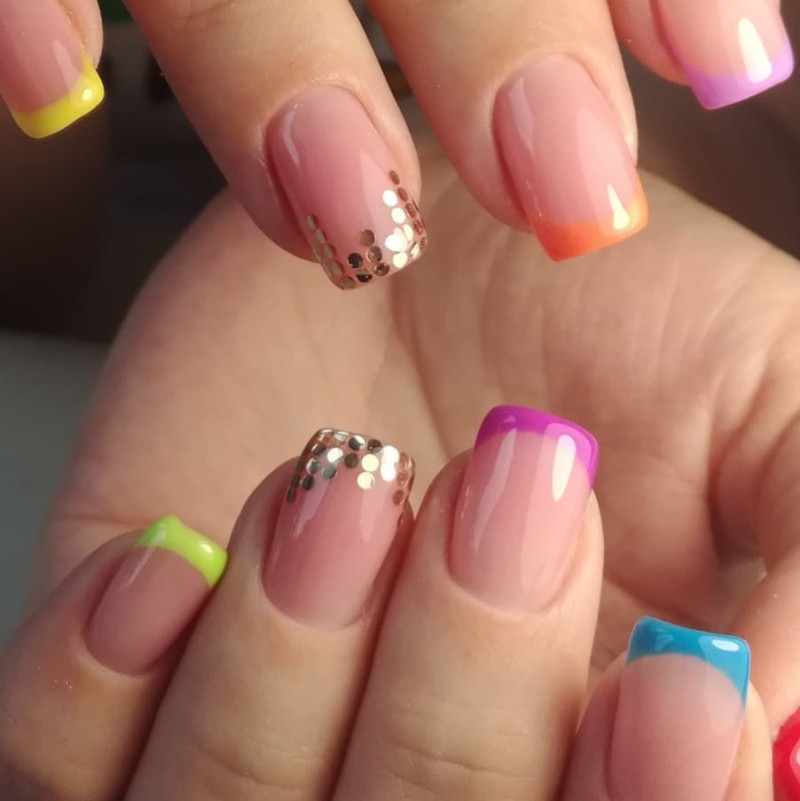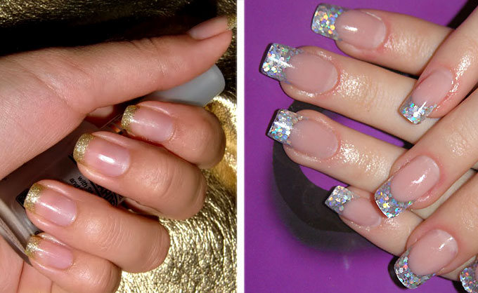 Тем, кто любит блестки, подойдет следующий дизайн, для которого понадобятся лаки с глиттером разных цветов (розового, голубого, золотистого, изумрудного и других). Пластина покрывается обычным бежевым цветом, а френч выполняется двумя лаками с блестками. Чтобы блестки было лучше видно, сделайте каемку широкой.