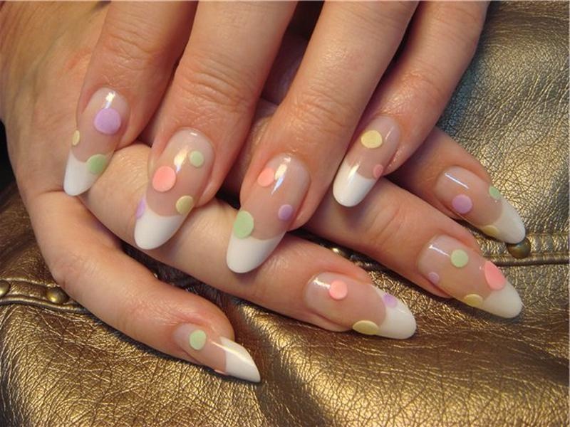 Точечный рисунок актуален в любое время. Он прекрасно подходит к разным стилям и образам, хорошо смотрится и с деловой одеждой, и с джинсами. Точки наносят на кончик ногтя в любом цветовом дизайне. Точки можно делать разного диаметра. Не бойтесь экспериментировать. Посмотрите на фото, как он оригинально смотрится.
