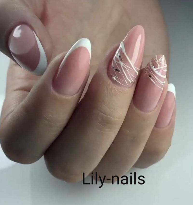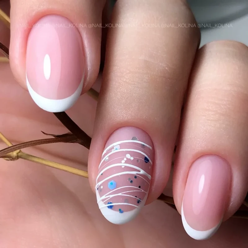 На нескольких пальчиках наносится лак в стандартной технике. На остальных рисуют переплетенные локоны белого цвета. Используют при этом белые и пастельные оттенки.