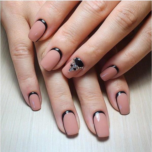 Простой маникюр снова в моде! Контрастные оттенки выглядят наиболее выигрышно. Сочетание молочно-розового цвета с черным смотрится довольно стильно. Такие ноготочки можно запилить в форму квадрата. Украсить один из ногтей можно черными стразами.