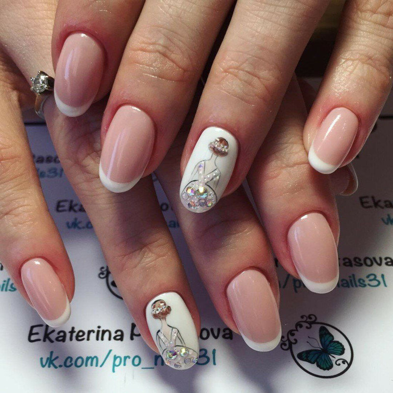 Небольшая длина ногтевой пластины смотрится ухоженно и красиво. Для маникюра подбираются нежные оттенки: белый, розовый, телесный. Один из ноготков украшается треугольными миниатюрными стразами, которые выкладываются в форме определенного рисунка.