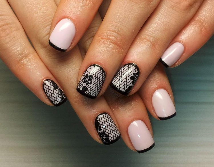 Классические варианты френча, дополненные изысканным кружевом, делают образ более женственным и утонченным. Обычно кружево прорисовывается в верхней части ногтевой пластины. Оно одинаково стильно смотрится на длинных и коротких ноготках.