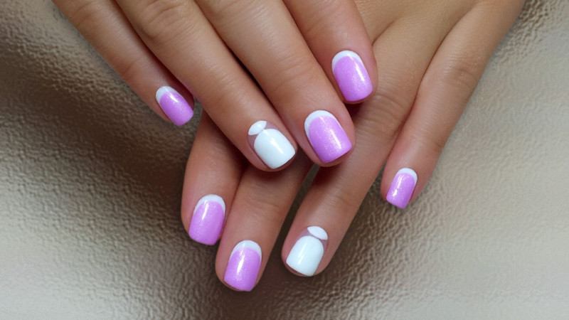 Особенно хорошо он смотрится на ногтях, имеющих форму мягкого квадрата. Вместо улыбки в таком дизайне применяются уголки в виде треугольников. Цветовая гамма может быть совершенно любой. В качестве базового лака выбирается бежевый, прозрачный или розовый лак.
