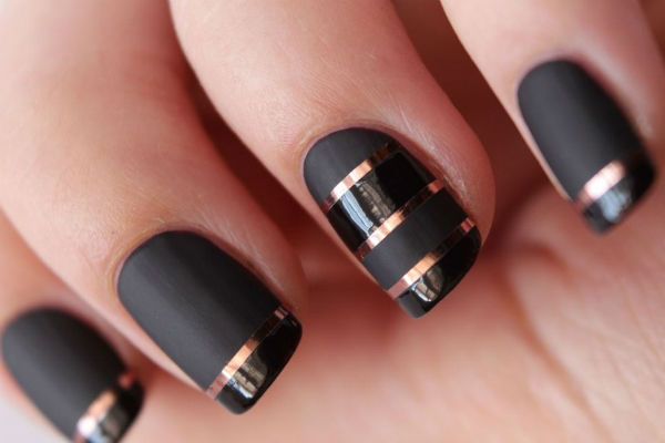 С каждым годом популярность дизайна с рисунком в виде полосок увеличивается. Для их создания можно воспользоваться специальной лентой или прорисовать их аккуратно кисточкой. Все неточности можно скорректировать при помощи ватной палочки.