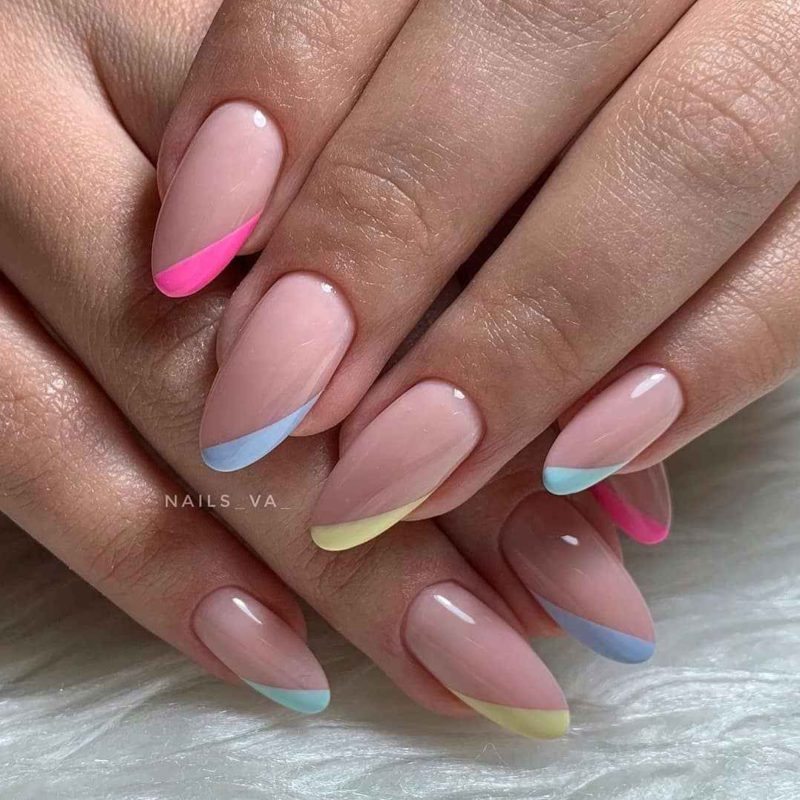 Самая простая идея для цветного французского маникюра – двойной или тройной френч в разных цветах. Например, на кончики можно нанести классический белый, выше – синий, розовый или любые другие по вкусу.