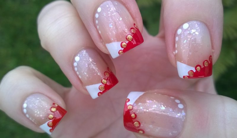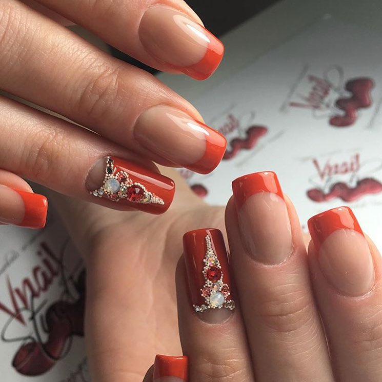 Этот маникюр считается классическим дизайном в Нейл-арте. В новом году изюминкой такого направления станут яркие кончики красного цвета в форме полумесяца, вместе с дорожками украшенными бусинками.