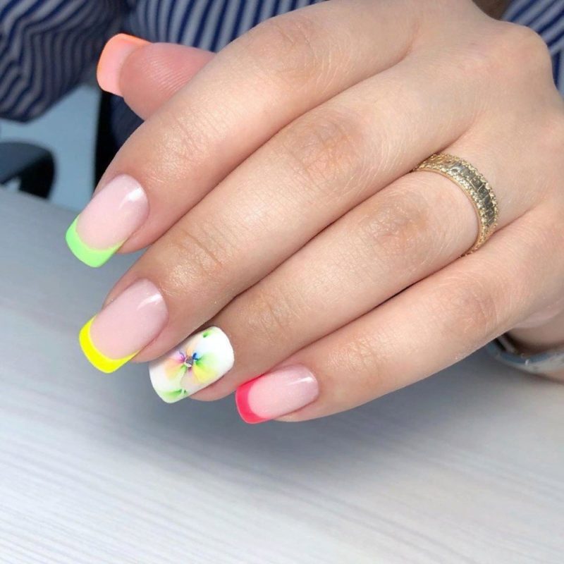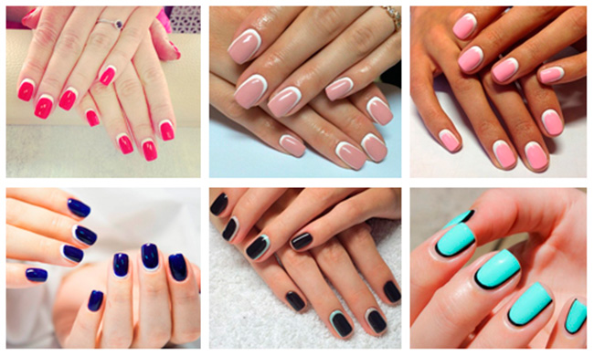 Самый трендовый вариант для коротких ноготков – нежный нейтральный ноготок с цветным краешком. Можно покрыть все ногти одним лаком, а можно на каждый ноготок подобрать отдельный оттенок.