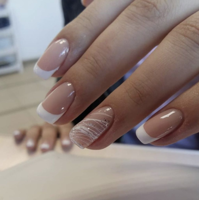 Те, кто не любит однообразие, делают выбор в пользу французского маникюра с дизайном, отличающимся на безымянном пальце.