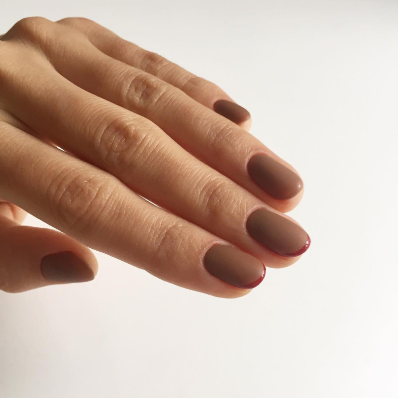 Матовая текстура, делающая ноготки бархатистыми, популярна уже не один сезон. Хотите сделать декор максимально необычным и стильным? Выбирайте матовый топ для оформления кончика пластины. База при этом может быть как глянцевой, так и матовой.
