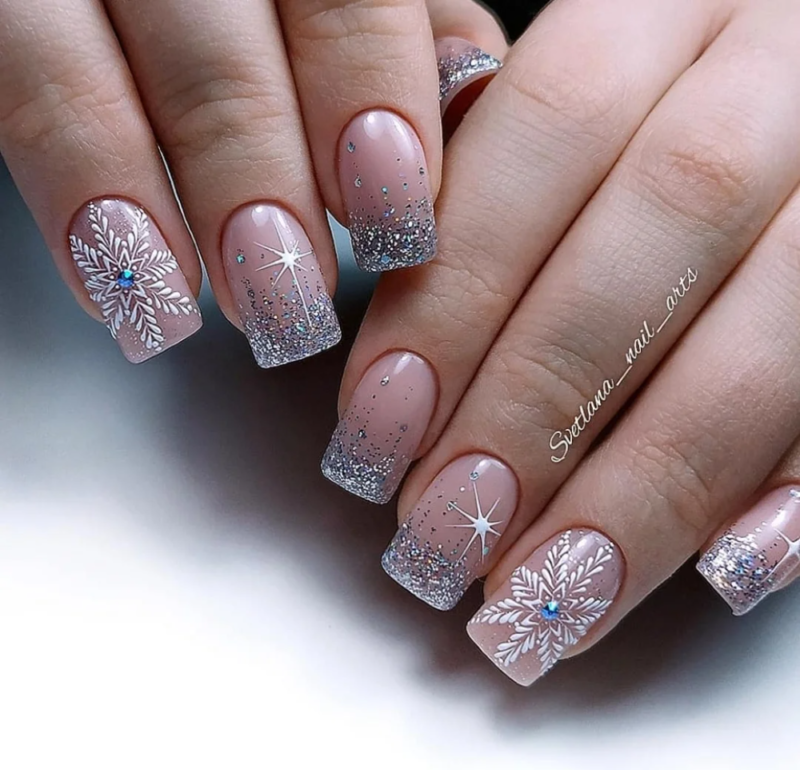 Французский маникюр с блестками используется в основном для создания праздничного маникюра. Они могут располагаться на кончике ногтя, выкладываться по линии изгиба «улыбки», в перевернутом френче в области кутикулы.