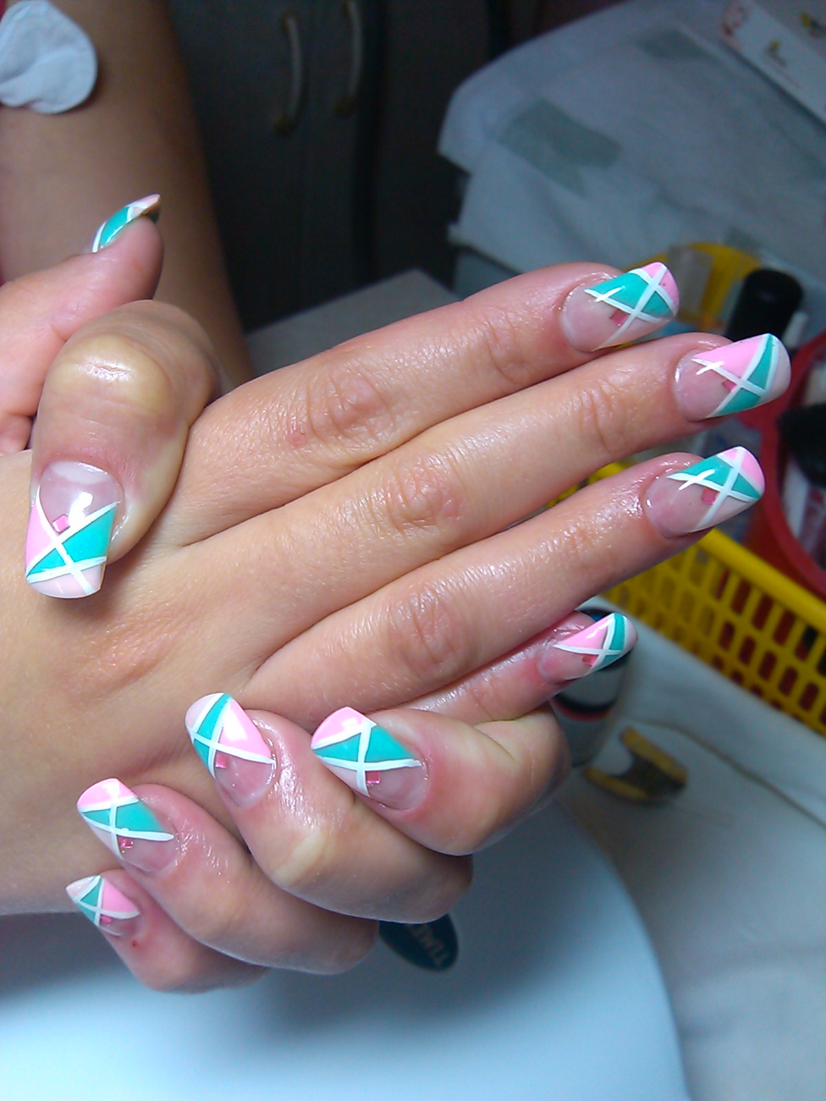 Особенно хорошо он смотрится на ногтях, имеющих форму мягкого квадрата. Вместо улыбки в таком дизайне применяются уголки в виде треугольников. Цветовая гамма может быть совершенно любой. В качестве базового лака выбирается бежевый, прозрачный или розовый лак.