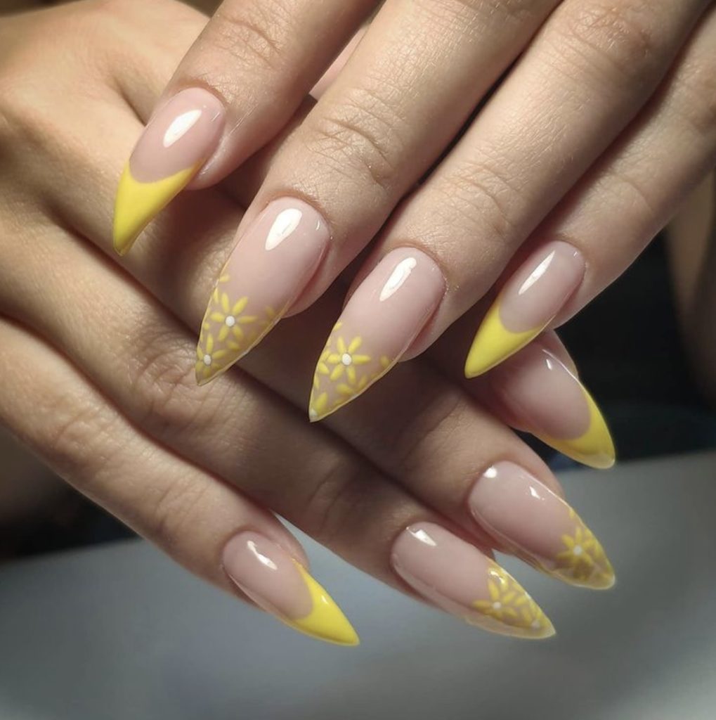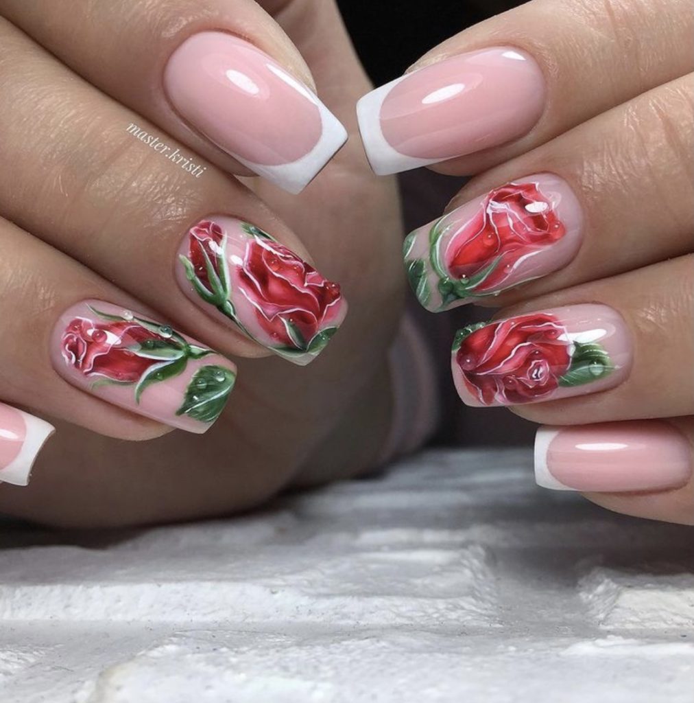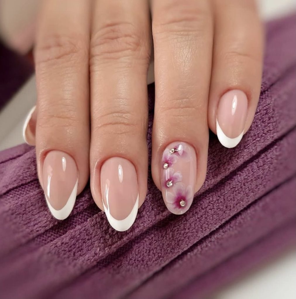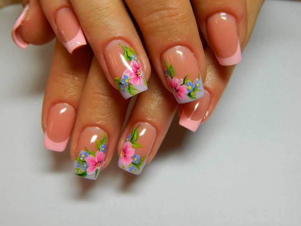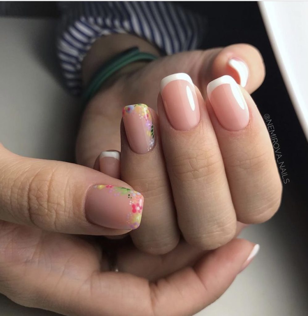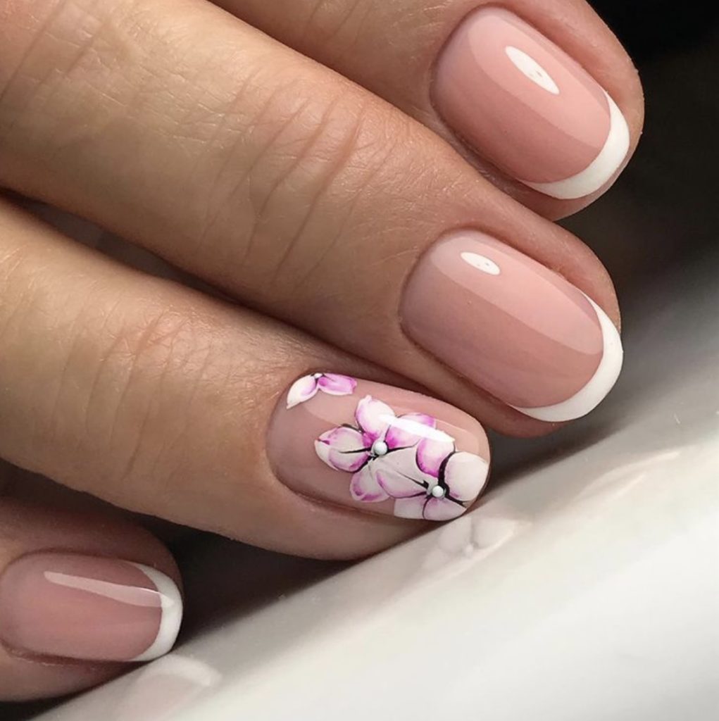 Чаще всего френч дополняют изящными цветочными мотивами. Они подчеркивают нежность и легкость дизайна. Для создания такого рисунка стоит выбирать пастельные тона. Впрочем, если вы хотите добиться яркого акцента, то насыщенные оттенки станут отличным решением.