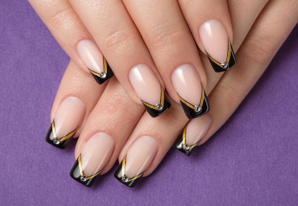 - К примеру, можно сделать френч золотого цвета, с блестками или без, обрисовать его черной полоской, а на кончик ногтя также нанести френч черного цвета.