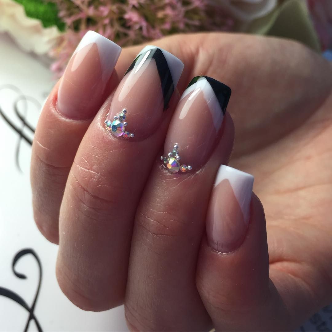 Французское оформление пальчиков с четкими стразами станет отличным вариантом дизайна для невест. Аккуратно выполненная роспись будет добавлять ногтям дополнительный изыск. Шик такому дизайну придает сдержанность.