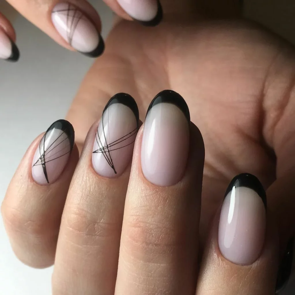 В тренде как акцентирование дуги черным лаком, так и нанесение его на всю ногтевую пластину с выделением дуги другим цветом. Также дизайнеры разработали массу вариаций по сочетанию в одном маникюре ногтей с черным «френчем» и полностью окрашенных в этот цвет.