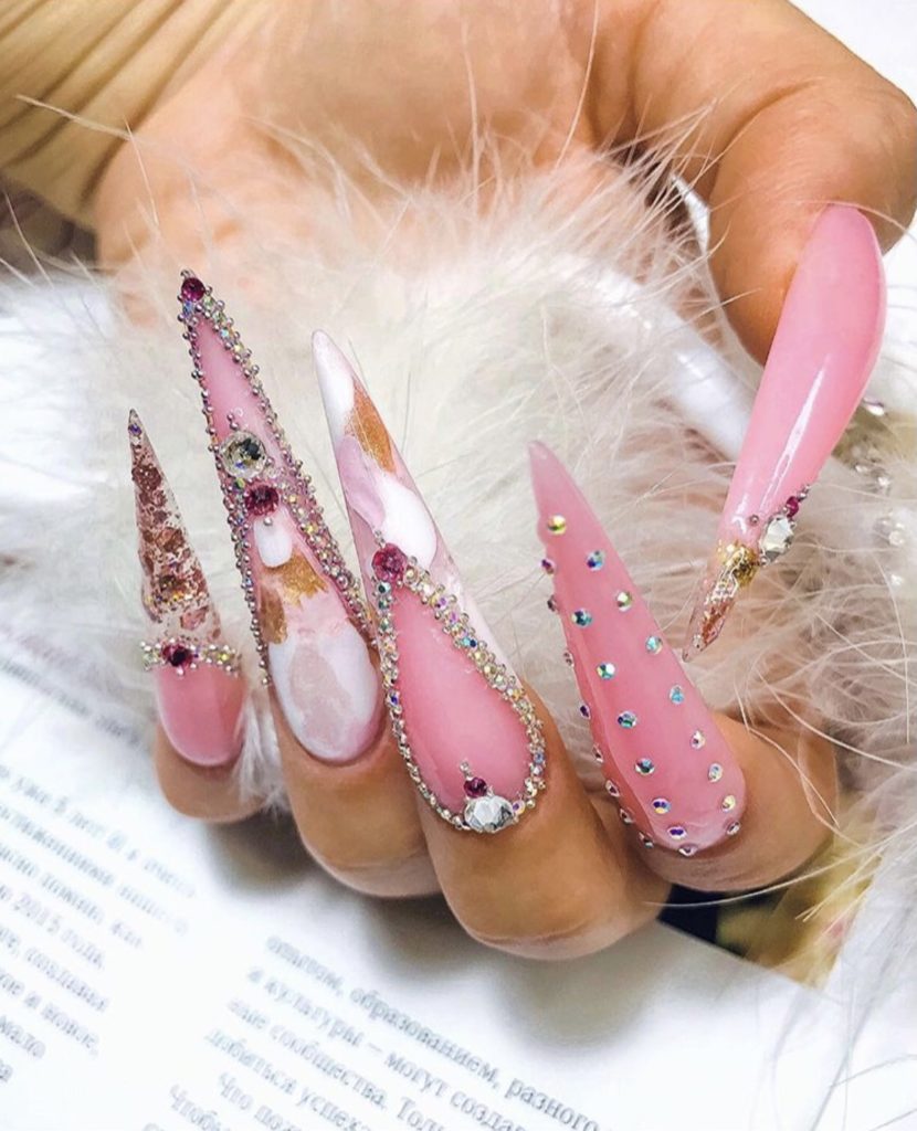 Модницы предпочитают богатый кружевной узор на ногте дополнять стразами и жидкими камнями. Выделяются 2 вариант создания подобного дизайна: c помощью наклеек и при помощи тонкой ткани. Новичкам следует начинать с более простого первого материала.