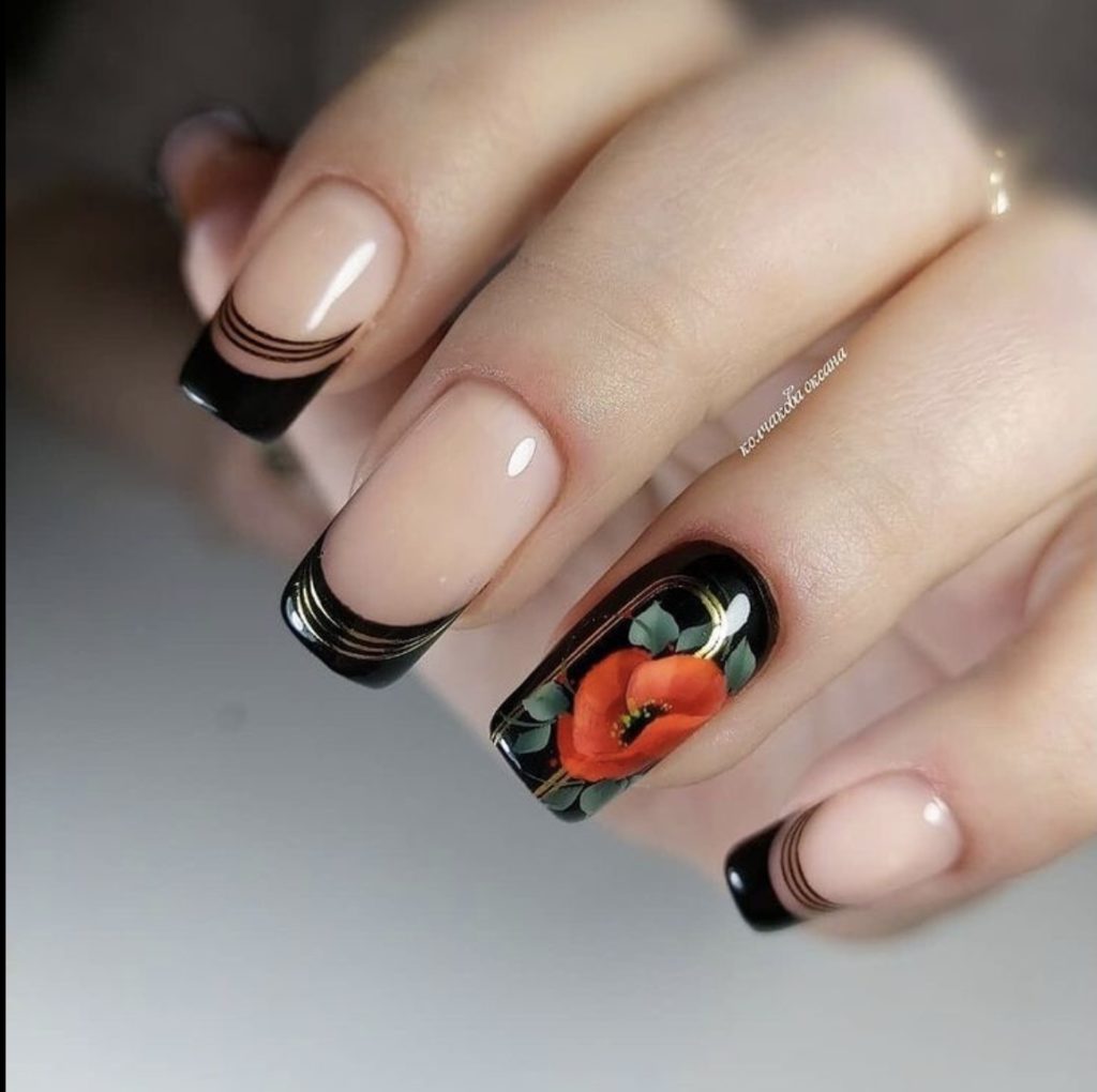 Еще один вариант – возьмите цветовую гамму из красного, черного и золотого цветов. Френч можно сделать черным, красным или чередовать их, а на самой пластине изобразить красные цветы и золотые листья, прорисовывая контур черным цветом.