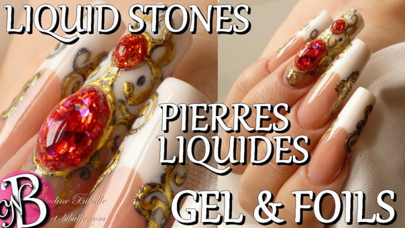 Жидкие камни — это, по сути, трехмерные кристаллы, сформированные с помощью геля. В еще жидкий гель «вживляют» искристые блестки и фольгу для создания эффекта сверкания. Создание такого камня требует практики, но в силу своей увесистости и объема ими все равно не украсить каждый ноготь, так что начинать практиковаться можно на одном безымянном пальце.