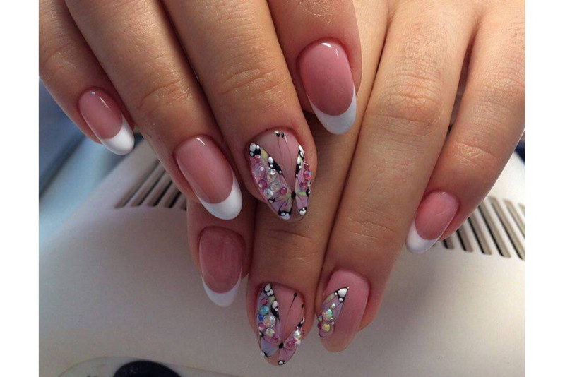 Но чтобы френч на миндалевидных ногтях не утратил элегантность, подбирайте украшения с большой осторожностью. От больших и «тяжелых» страз лучше отказаться в пользу небольших и аккуратных украшений. Такой дизайн будет стильным и привлекательным