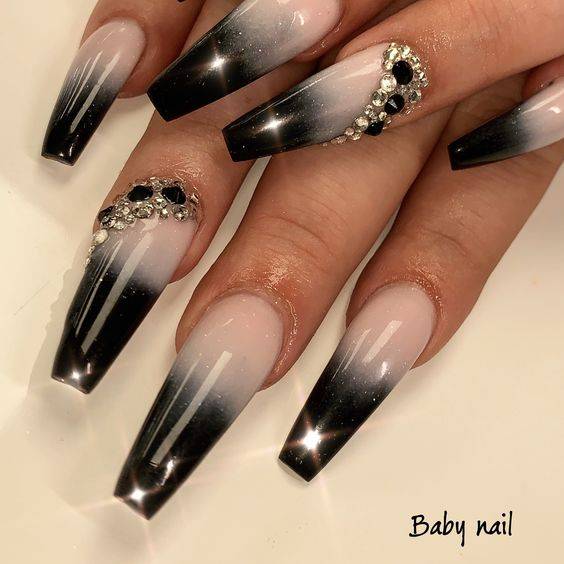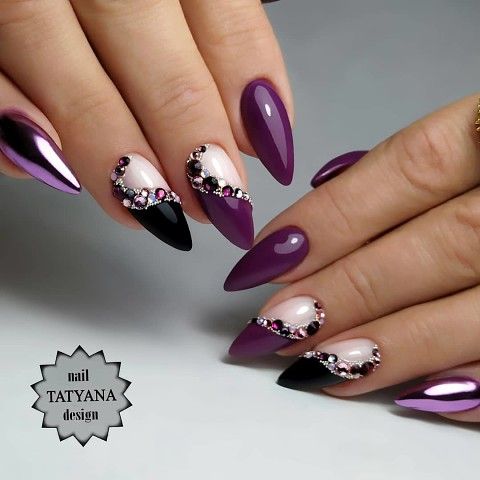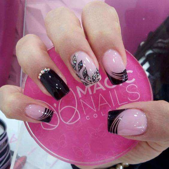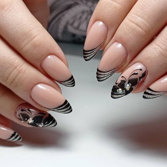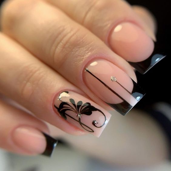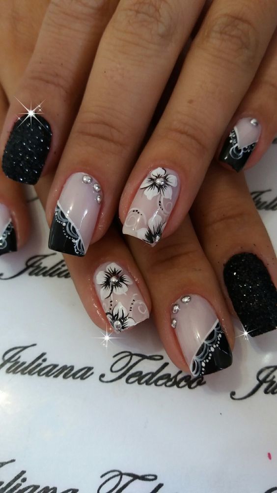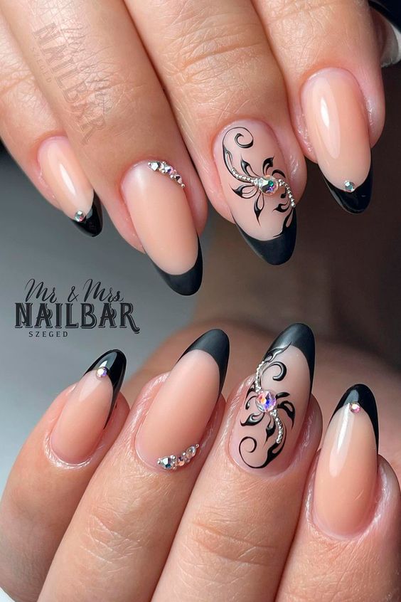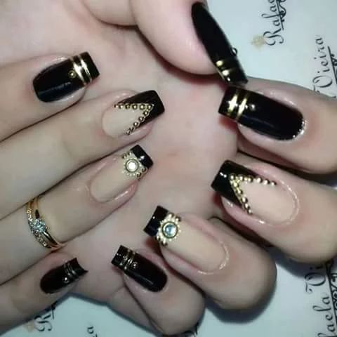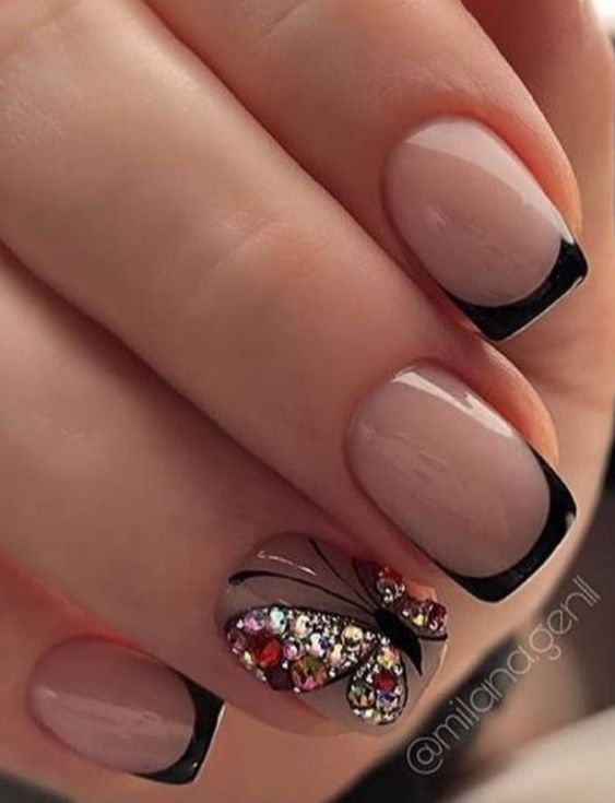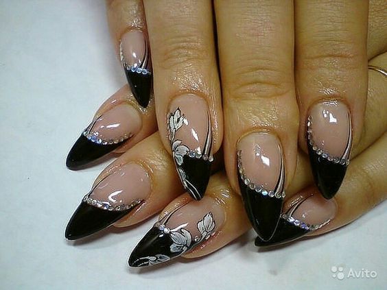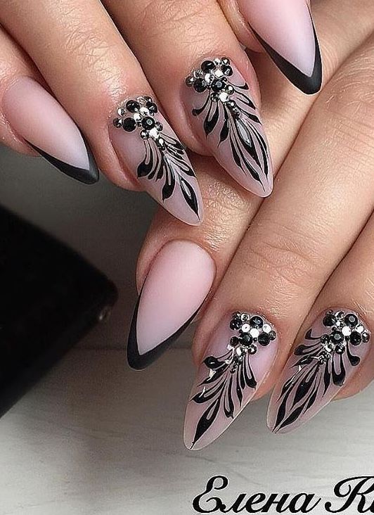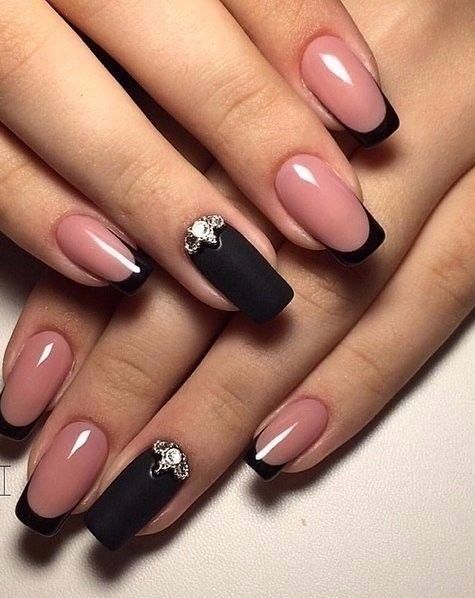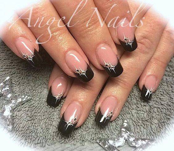 Чёрный френч со стразами призван завершить шикарный образ. Дизайн будет удачным, если не переборщить с камнями. Здесь особенно важна мера. Для такого дизайна берут исключительно качественный материал, поскольку чёрный цвет способен обнажить любой изъян.