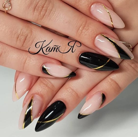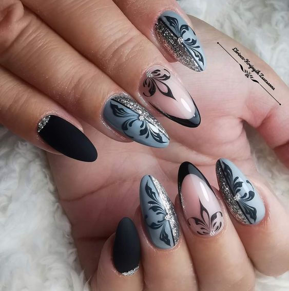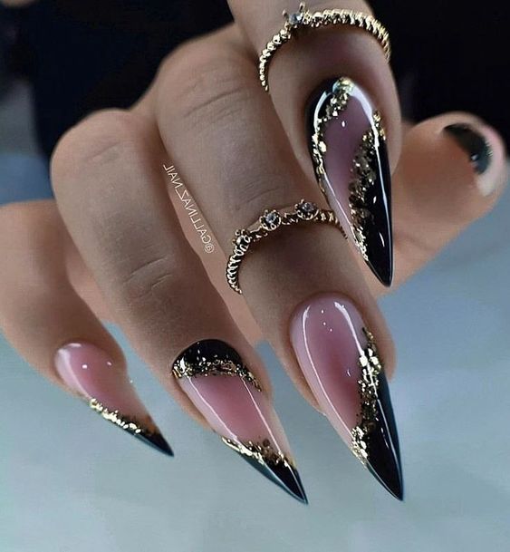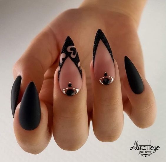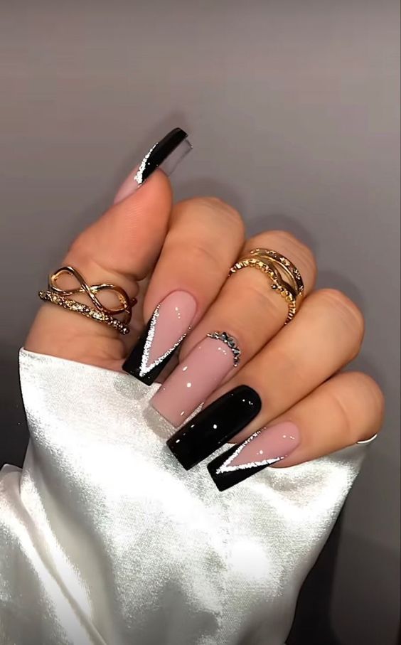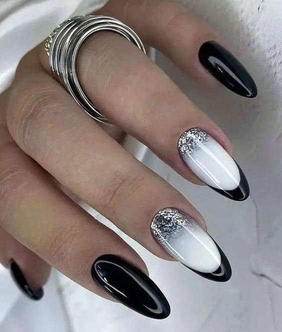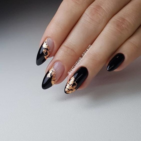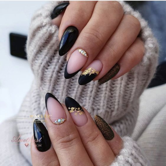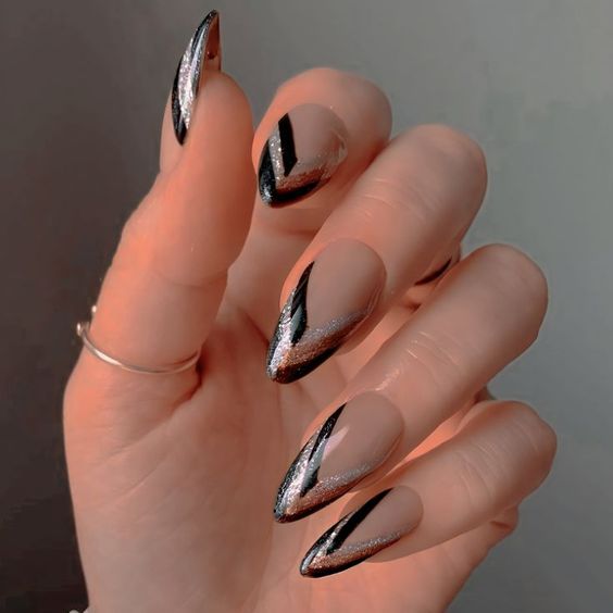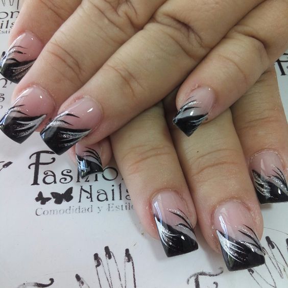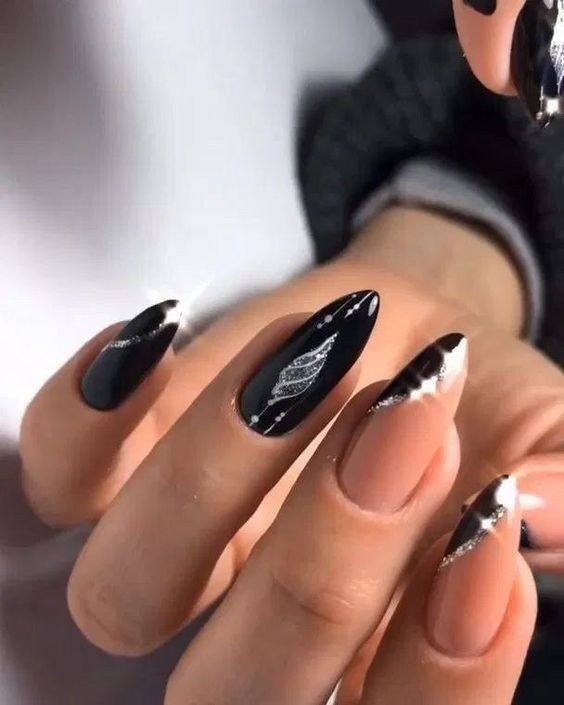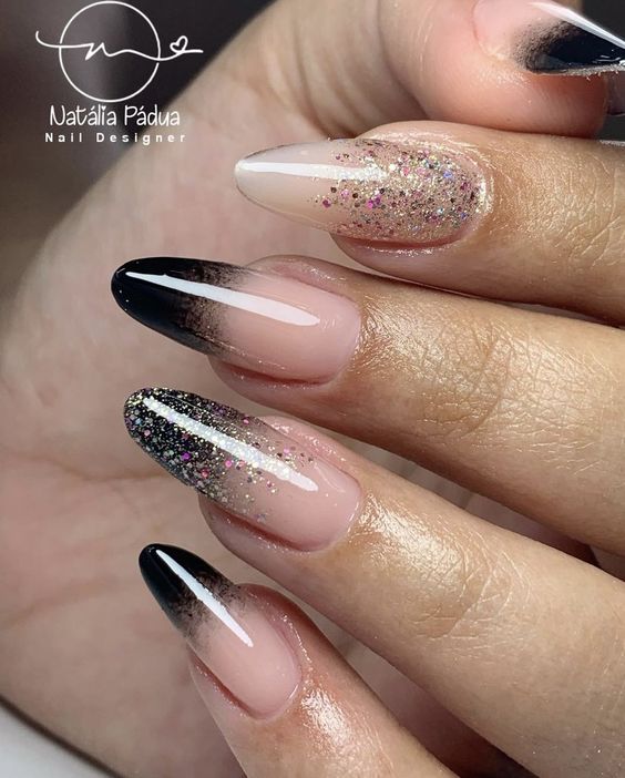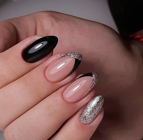 Блестящий элемент великолепно смотрится на чёрном. Чаще, это праздничный вариант, который подбирают в соответствии с костюмом. Но результат напрямую зависит от качества и особенностей глиттера, что позволяет использовать технику на каждый день.