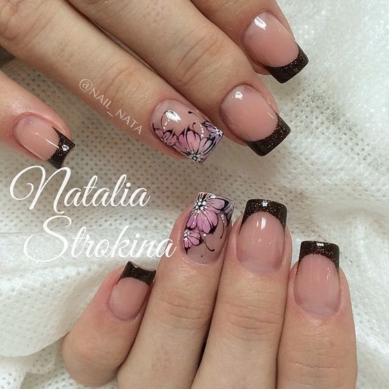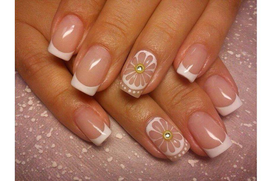 Аккуратный френч с элементами цветов выглядит благородно и нежно. Вариант отлично подходит для праздников и будней. Он же — великолепный вариант для особого торжества.