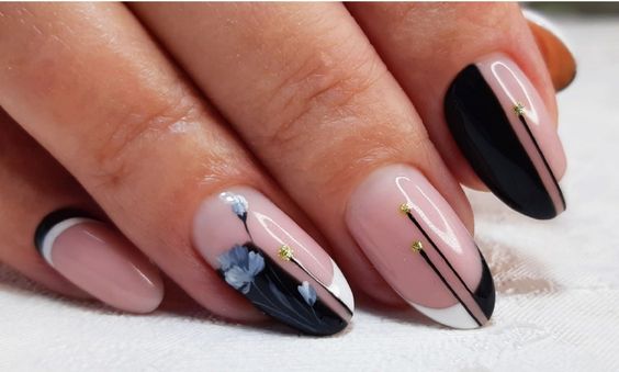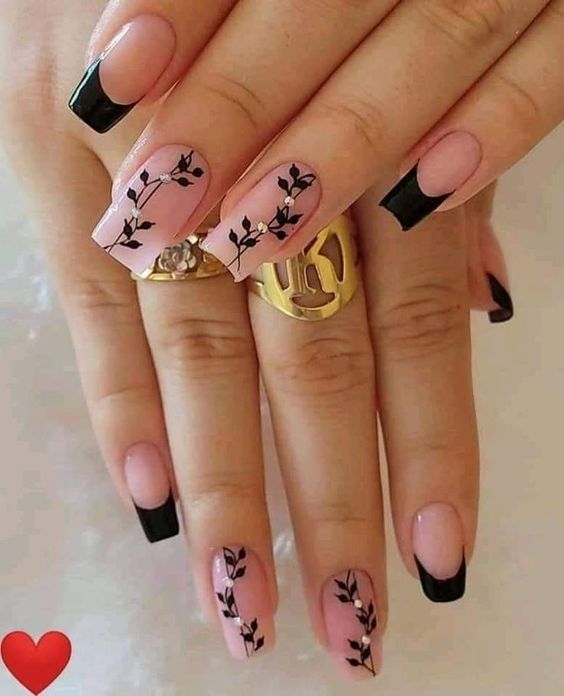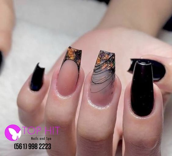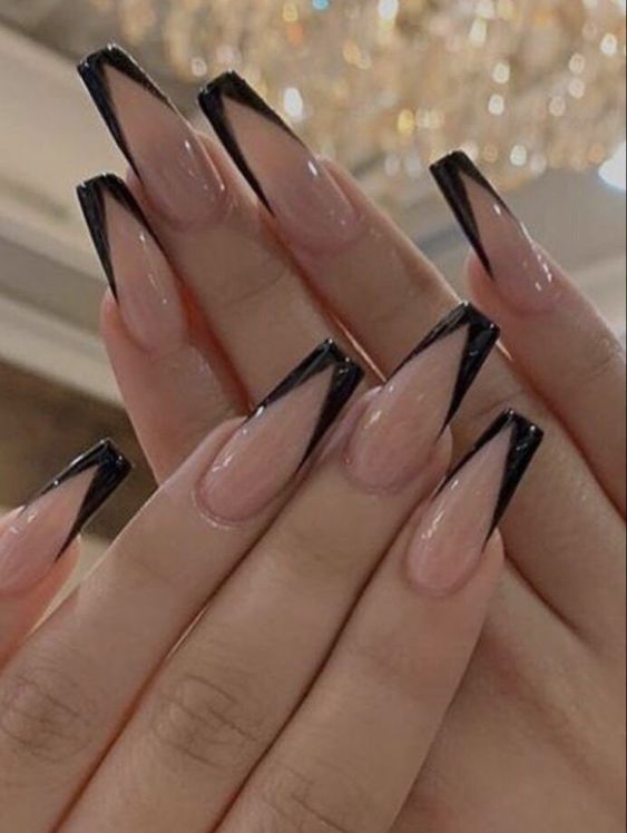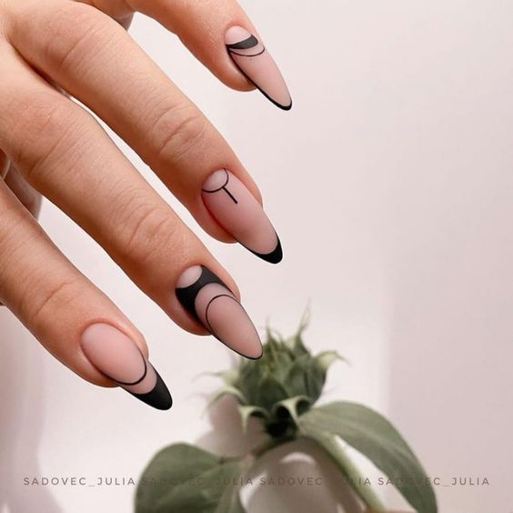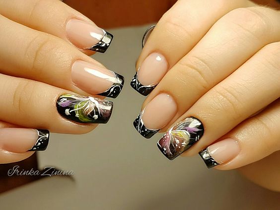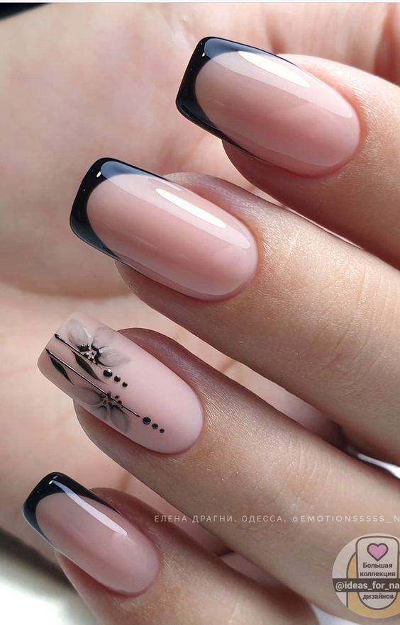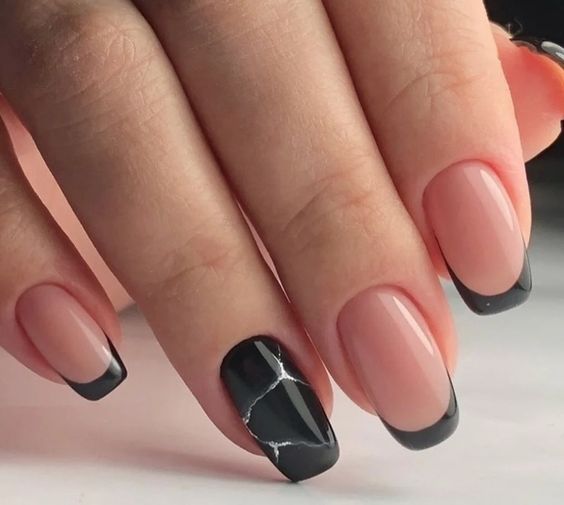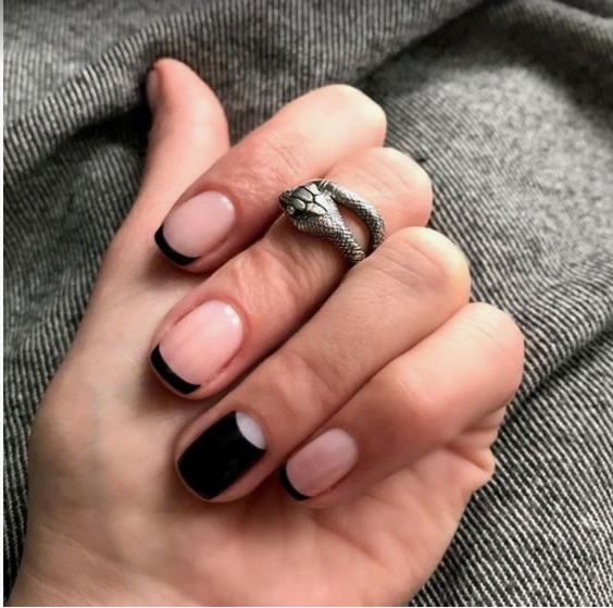 Чёрный френч с лунным маникюром становится всё более популярным. В тренде — контраст, где чёрный превалирует. Лунку можно выполнить в светлых тонах. Техника больше подходит для длинных ногтей, поскольку визуально она укорачивает ногтевую пластину.