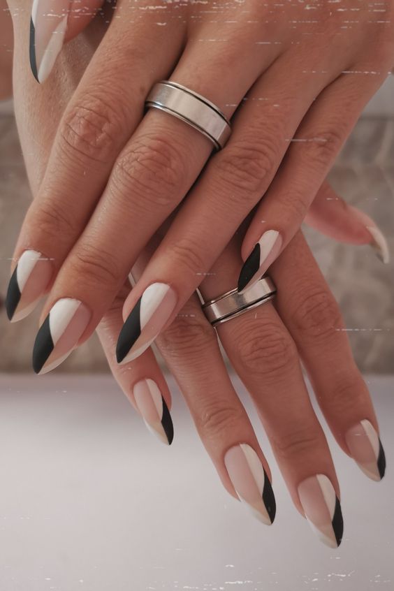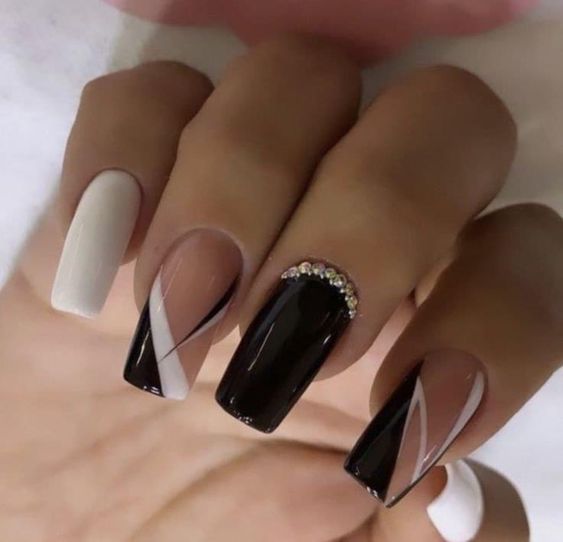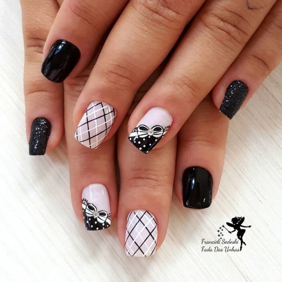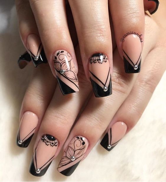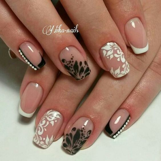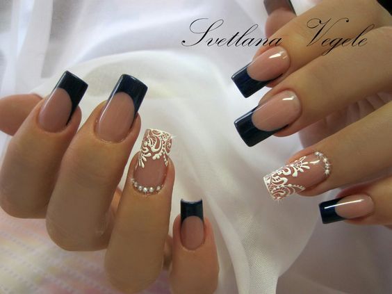 Одно из самых интересных решений. Кайма здесь будет шире обычной, выполняется она по диагонали. Остальное — дело фантазии: совмещение чёрного с белым, оформление блёстками или стразами. Техника для тех, кто любит нетривиальный подход во всём.