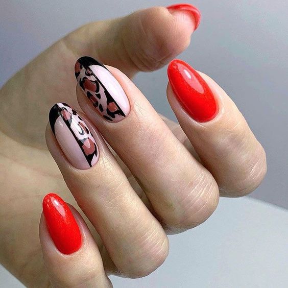 К примеру, красным цветом лакового покрытия можно накрасить всю ногтевую пластину, лишь линию улыбки стоит выделить белым оттенком. Также данную комбинацию цветов можно расположить в ином порядке.