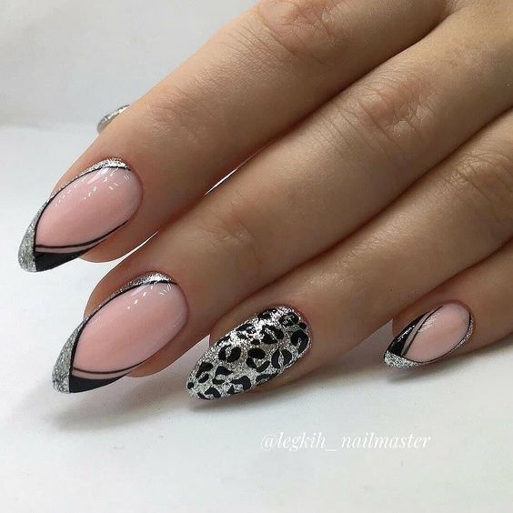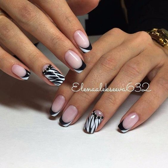 Супергорячий тренд – френч с рисунком, имитирующим животный принт. Зебра, жираф, леопард – выбирайте самостоятельно. Все эти виды френча на ногтях смотрятся сногсшибательно!