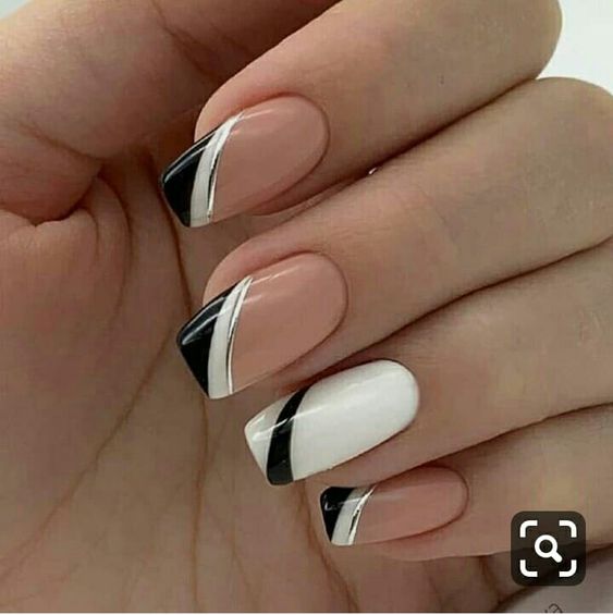 С помощью асимметрии легче создать оригинальный стиль, аналога которому будет не найти. Для её создания преимущественно используют скошенные линии. Это может быть улыбка или произвольный зигзаг. Такой френч великолепен в дизайне с чёрно-белым мрамором или с геометрией. Главное — сочетаемость с другими элементами образа.