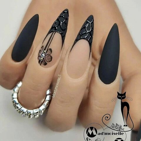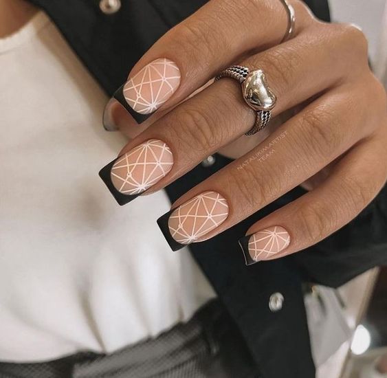 Чёрный френч буквально создан для рисунка, идей которого существует множество: тонкое кружево или паутинка, сдержанная графика или тату. Кто-то выберет геометрию или вуаль, все они превосходно смотрятся на чёрном.