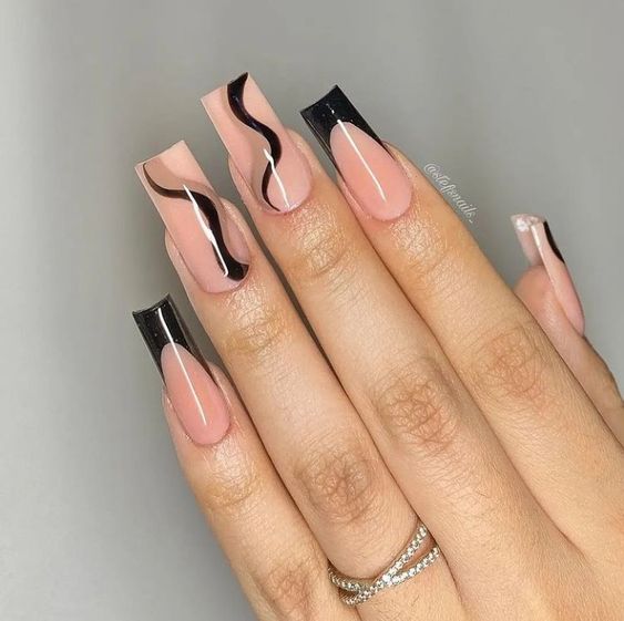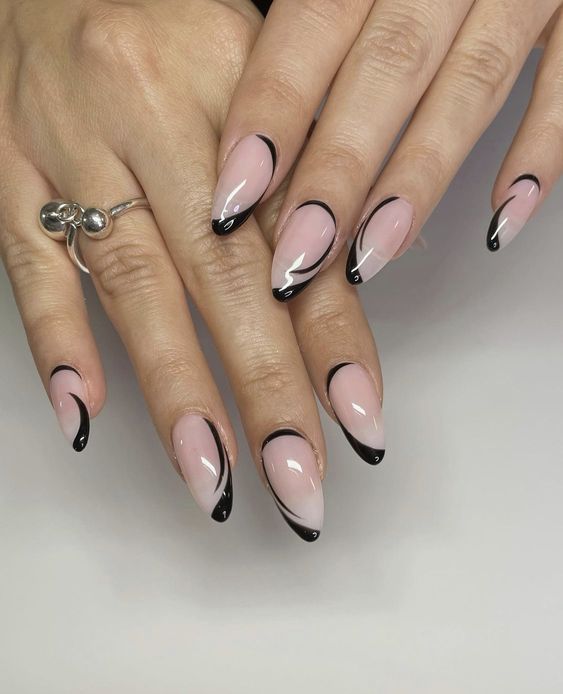 Это техника удлинённой пластины с вытянутой линией улыбки. Выполняют такой френч с помощью специального геля, который впоследствии покрывают чёрным лаком и декором. Техника для смелых и решительных.