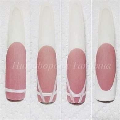 В первом варианте выполнения такого маникюра на ногти наносится базовый лак выбранного бежевого, розового или вообще прозрачного цвета. Нанести его можно в один слой, а для более интенсивного цвета и плотного покрытия в два. Даем лаку хорошо высохнуть. Затем одинаково на все ногти наклеиваем полоски таким образом, чтобы оставить свободным кончик
