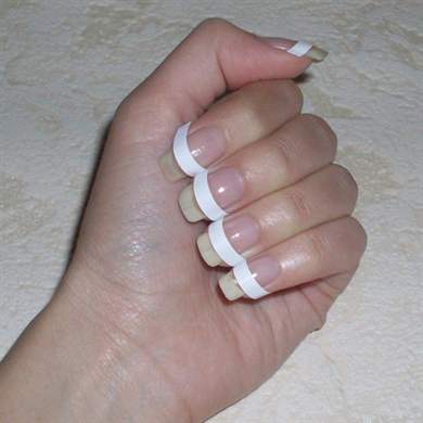 Самый простой способ нарисовать «французскую улыбку»- воспользоваться трафаретом для френча на клеевой основе. Эти, облегчающие жизнь полосочки, нужно приклеить на ноготь, отступив от края на желаемую ширину и уверенно закрасить свободную поверхность кончиков ногтей белым лаком. Недостаток этого способа в том, что невозможно сделать идеальную линию.
