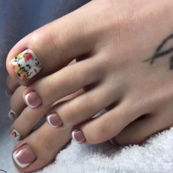 В этом году одной из модных тенденций при нанесении френч педикюра является использование геометрических фигур, флористические узоры, различные полоски. Казалось бы, какая связь между стилем французского педикюра и вышеперечисленными элементами? Но работники индустрии красоты прекрасно сочетают классическую белую или черную окантовку ногтя, нанося в то же время на ноготь парящую бабочку, разноцветные ромбы или классические красные маки.