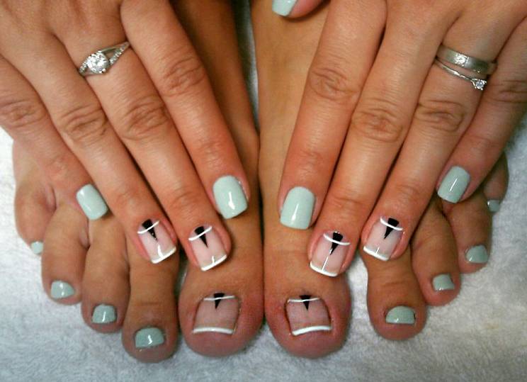 - Рекомендую делать одинаковый дизайн на ногтях рук и ног – это смотрится очень эстетично. Если дизайн на руках и ногах отличается, это обычно говорит об отсутствии вкуса у носящей его особы.