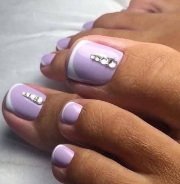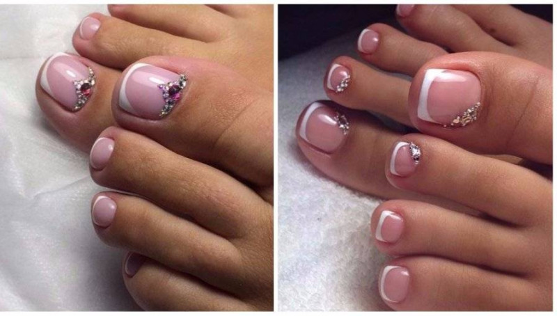 Для того чтобы он смотрелся естественны и изысканно, необходимо, чтобы ногти были не короткими, аккуратно подстрижены. Желательно закруглить уголки, а вдоль окантовки можно расположить ряд неброских страз – в этом случае ваши ноги будут выглядеть отлично. Хочется разнообразить классический вариант?