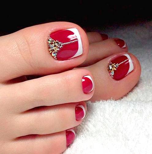 Если классический французский педикюр вас не устраивает, то можно его разнообразить. Например, попробовать базовое покрытие яркого цвета. Белый хорошо сочетается с красным или алым оттенком. При этом процедура повторяется в точности, как и в классическом варианте.