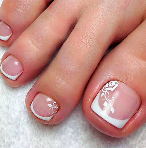 Френч на ногах очень похож на французский маникюр, основная разница лишь в том, что этот характерный стиль украшения ногтей используется на ногах, а не на руках. Такой педикюр отличается тем, что состоит из двух цветов. Первым слоем наносится нейтральный телесный цвет, близкий к персиковому. Этим лаком нужно покрыть весь ноготь. Вторым цветом наносят белоснежный оттенок – тонкой линией у края ногтя. Эта линия отличает французский маникюр или педикюр от других стилей. Обычно красят только кончик ногтя, который чуть выступает за подушечку пальца, потому толщина белой полоски зависеть от длины ногтя.