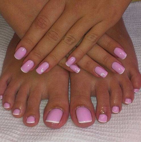, а одинаковый дизайн на ногтях ног и рук смотрится очень красиво. Французский педикюр не бросается в глаза, но не остается незамеченным