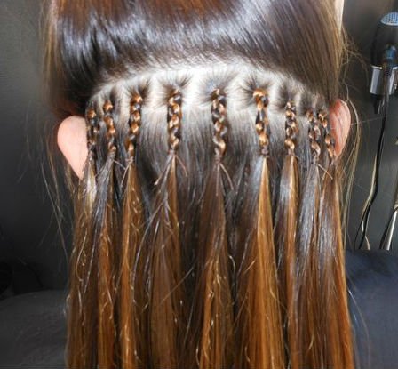 - Берут прядь Ваших волос и наращиваемых, их заплетают в косички при помощи термически обработанной нити. Она позволит Вам выпрямлять и завивать волосы в дальнейшем.