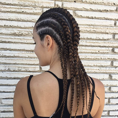 Брейды можно заплести как ровными полукруглыми рядами, так и по диагонали, что позволяет увеличить густоту и объем волос за счет накладных прядей по всей зоне головы.