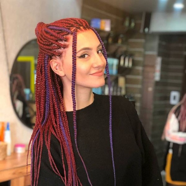 - Точечный — выделяют небольшую прядку и в нее вплетается косичка. От корня идет свой цвет волос, который перемешивается с цветом канекалона. Видна разметка на коже головы в виде квадратиков. Затраченное время до восьми часов.