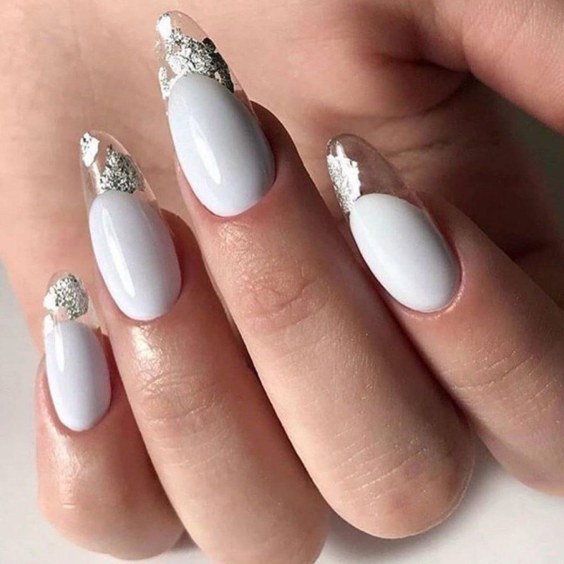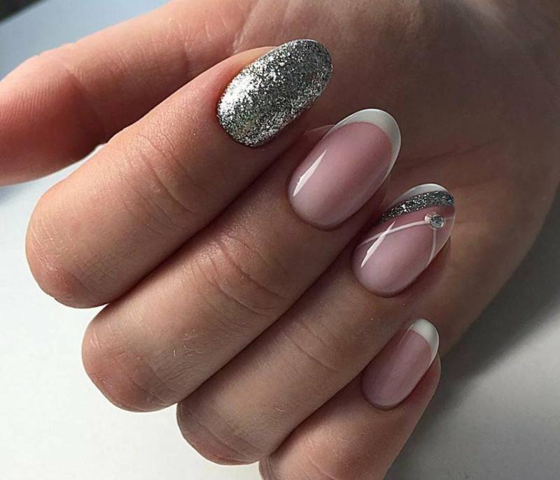 Еще один вариант универсального цвета — серебро, подойдет для создания холодного праздничного варианта френча. Серебро наноситься в качестве цвета на зону улыбки, может использоваться в виде декора, украшения либо рисунка.