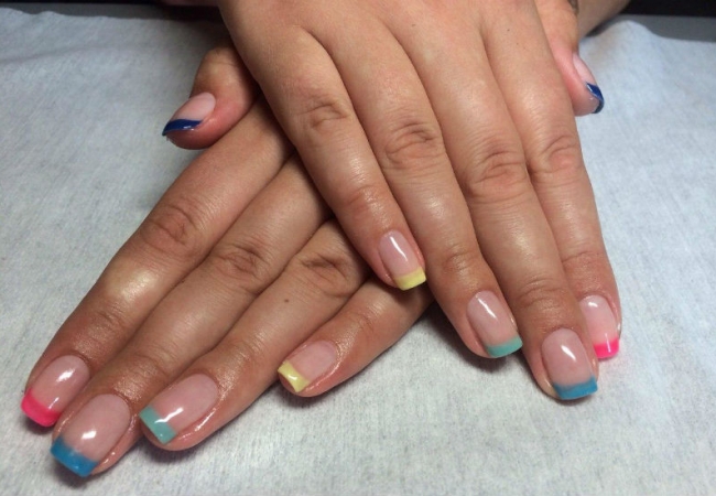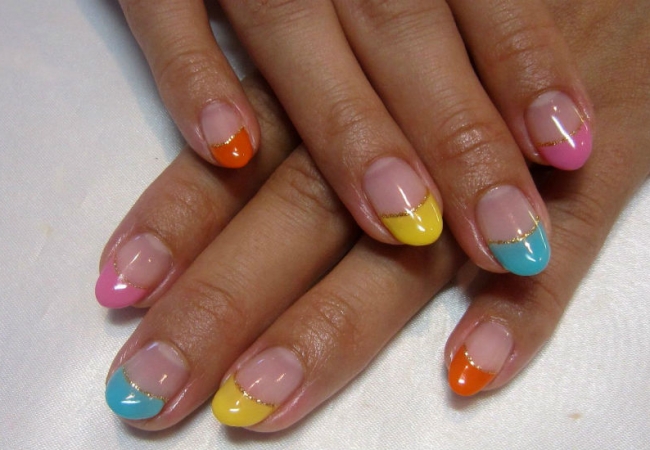 | цветной френч | Свободный край покрывается любым однотонным и контрастным гель-лаком. |